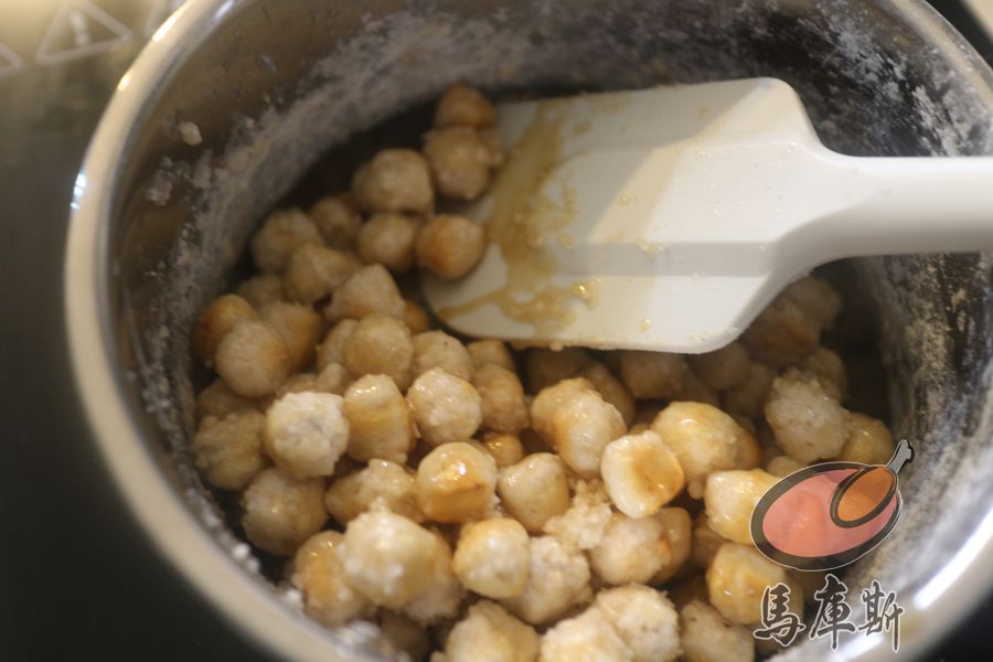 - 這個時候,糖會開始附著上堅果,而且慢慢形成一層灰白粉狀的包覆。
